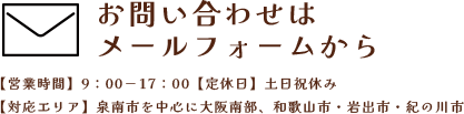 対応エリア | 泉南市を中心に大阪南部 和歌山市・岩出市・紀の川市 |